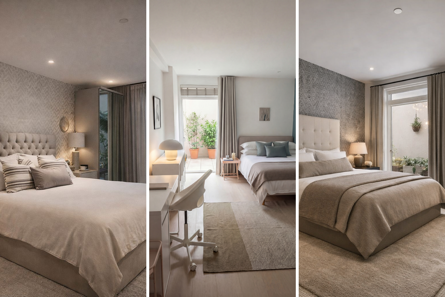 A calm, well-proportioned three-bedroom layout with two en-suite doubles, generous built-in storage, and direct access from all three bedrooms to the rear patio.